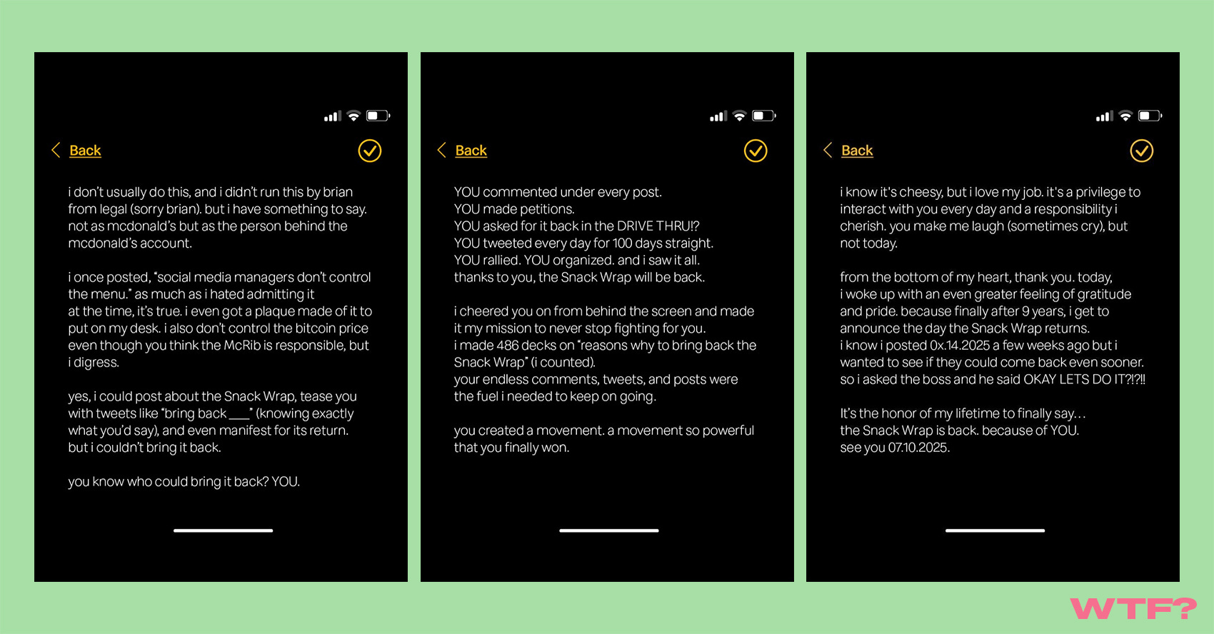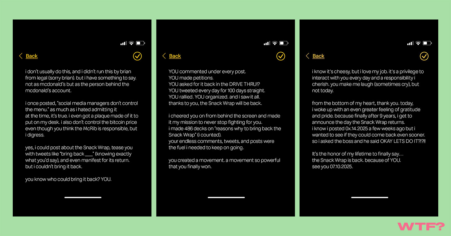 The Tea: You’ve probably heard that McDonald’s is officially bringing back the Snack Wrap. But instead of sharing a highly-produced reel or a chaotic meme, the fast food giant took a different approach to announcing the return of this fan-favorite item on social media: by letting the social media manager break the fourth wall. In a post on Instagram and X, we hear not from the brand, but the community manager, as they share a candid recount of the years spent engaging with McDonald’s fans and trying to convince corporate to bring back this retired item. Various social listening evidence is included in the Instagram carousel announcement, showing the power that social media users can have on a brand.