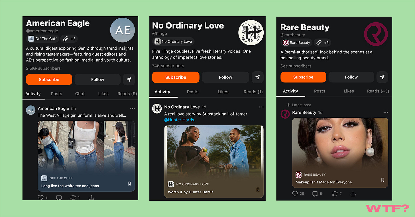 The Tea: No social media platform is devoid of brand accounts for long, and Substack is no exception. Over the past few months, the number of brands launching their own Substack publications has been rising. American Eagle collaborated with Casey Lewis from After School for its Gen Z cultural digest, Off the Cuff. Beauty brands like Rare Beauty and Saie use their Substack newsletters to offer behind-the-scenes exclusives and makeup tips. Bandcamp created a music discovery newsletter to highlight new artists, and Hinge launched a five-part weekly series to share stories about the realistic moments that occur during the early stages of dating.