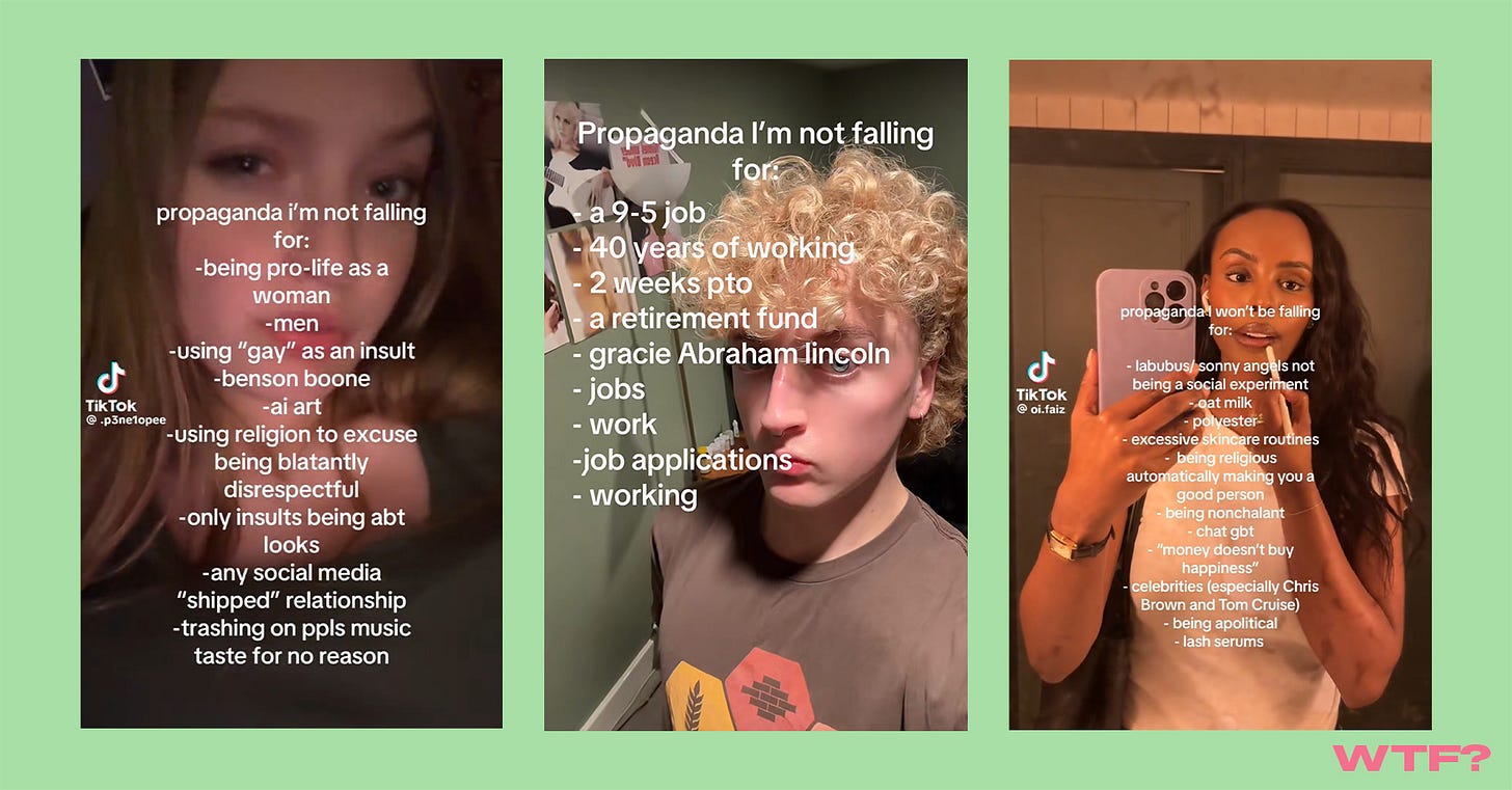 The Tea: That’s the question I’ve been stirring over after drowning in a sea of the latest social media trend, “propaganda I’m not falling for.” Over the past week, there’s been a flurry of posts where users define a diverse list of popular trends, people, products, or ideas they say they’re not buying into. Some items include labubus and sonny angels (rude), pilates, manifestations, trad wives, oat milk, and Benson Boone (Thomas, if you’re reading this, I hope you’re smiling). If you were curious to see which things came up the most, Casey Lewis from After School posted a TikTok about it here. Others have also taken it upon themselves to put together a list of “propaganda I AM falling for,” as a way to offer a different perspective on the trend.